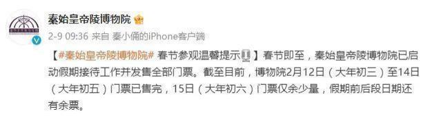 据秦始皇帝陵博物院(秦始皇兵马俑博物馆)2 月 9 日发布的最新提示:2 月 12 日(大年初三)至 14 日(大年初五)门票已售完,15 日(大年初六)门票仅余少量,假期前后段日期还有余票。
