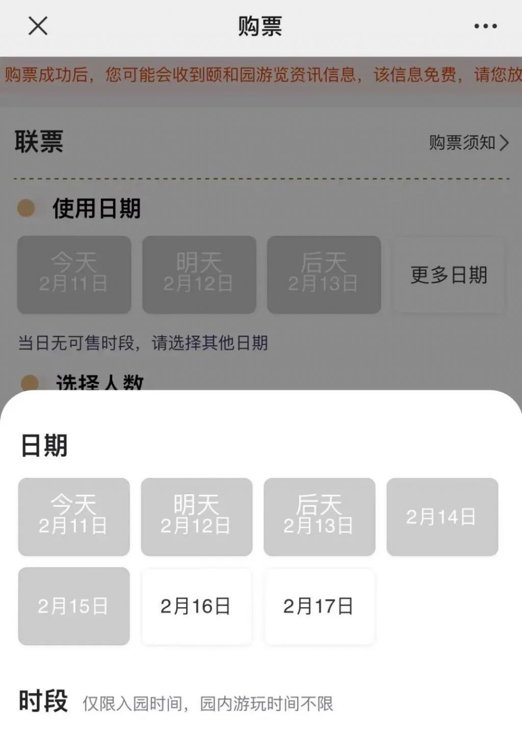 颐和园官方在线购票微信公众号显示,当前至大年初六(2 月 15 日)已无可售时段的门票。