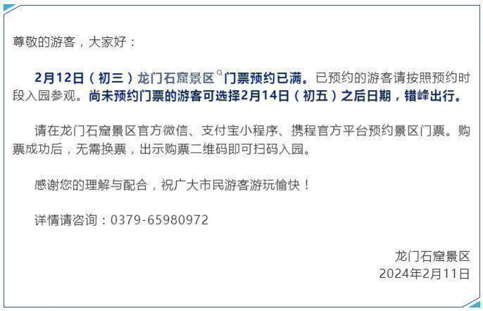 据洛阳发布微信公众号消息,2 月 12 日(初三)龙门石窟景区门票预约已满。尚未预约门票的游客可选择 2 月 14 日(初五)之后日期,错峰出行。