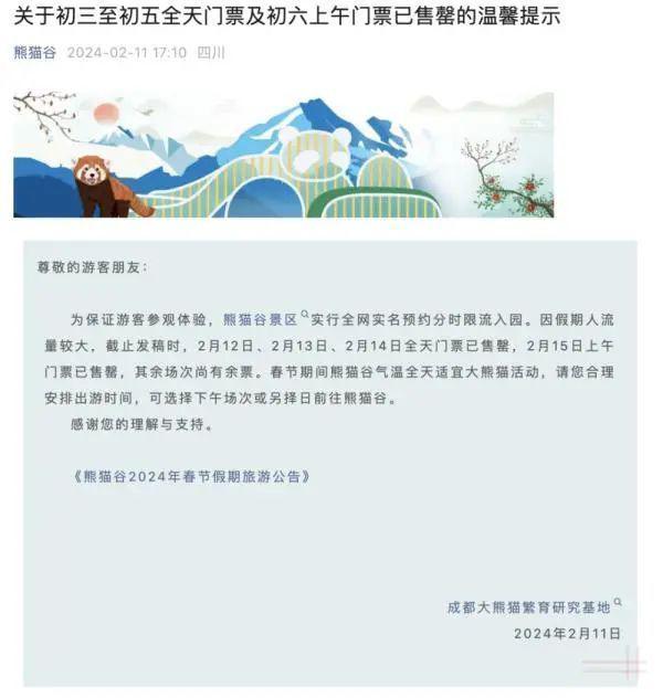 据 " 熊猫谷 " 微信公众号 2 月 11 日消息,2 月 13 日、2 月 14 日全天门票已售罄,2 月 15 日上午门票已售罄,其余场次尚有余票。