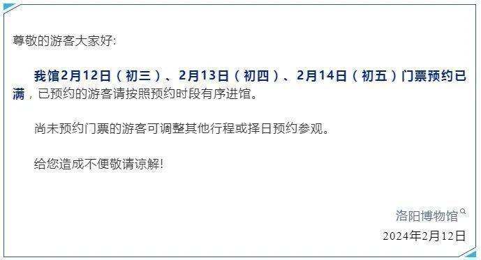 据洛阳发布微信公众号消息,洛阳博物馆 2 月 12 日(初三)、2 月 13 日(初四)、2 月 14 日(初五)门票预约已满。