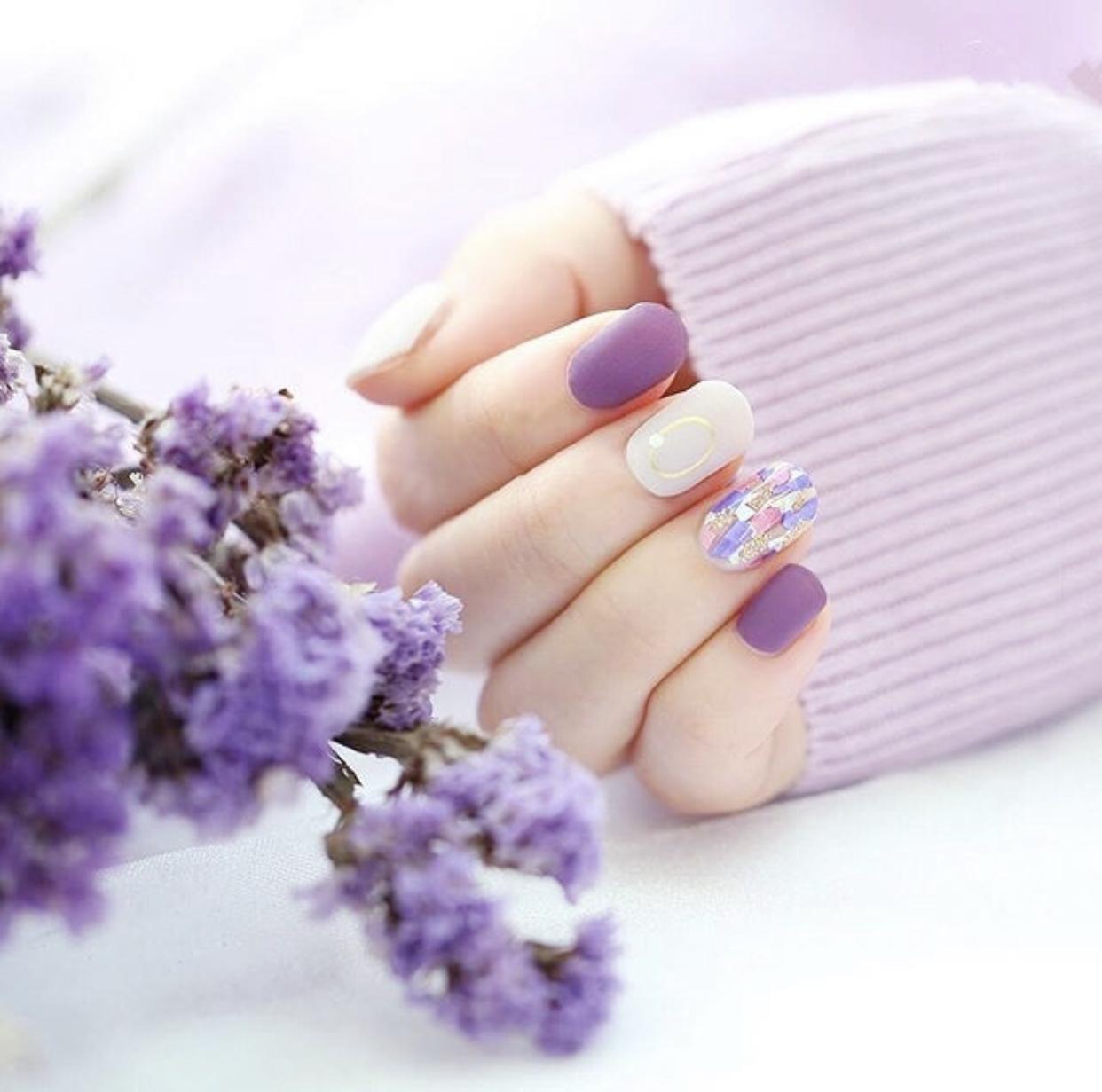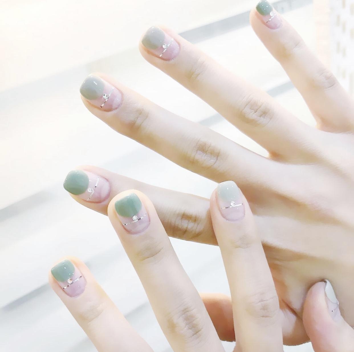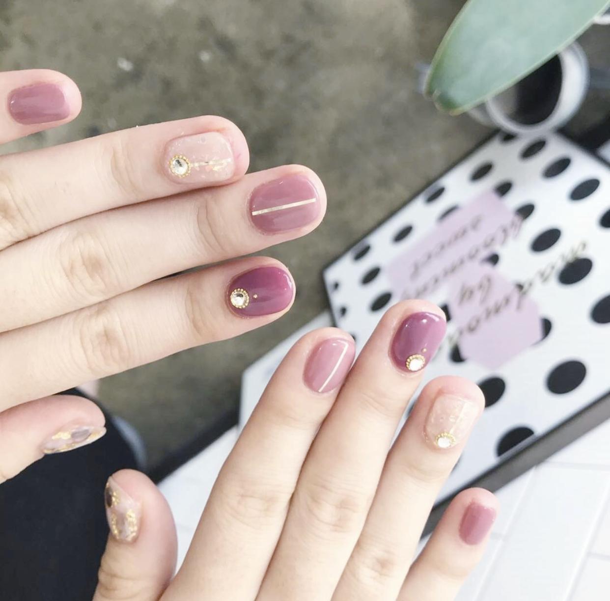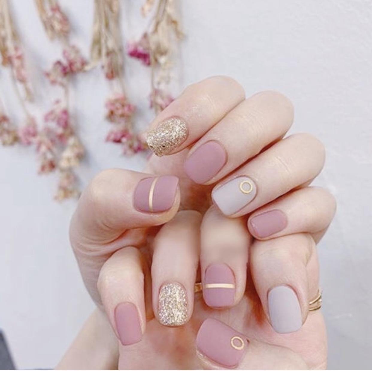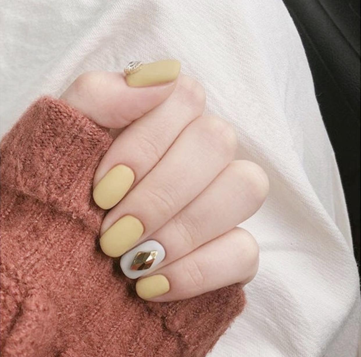 在磨砂质感的甲面上,加上一些简单的饰品,会让指尖呈现出更加精致些效果,这种简约风的精致感,也是非常有吸引力的~