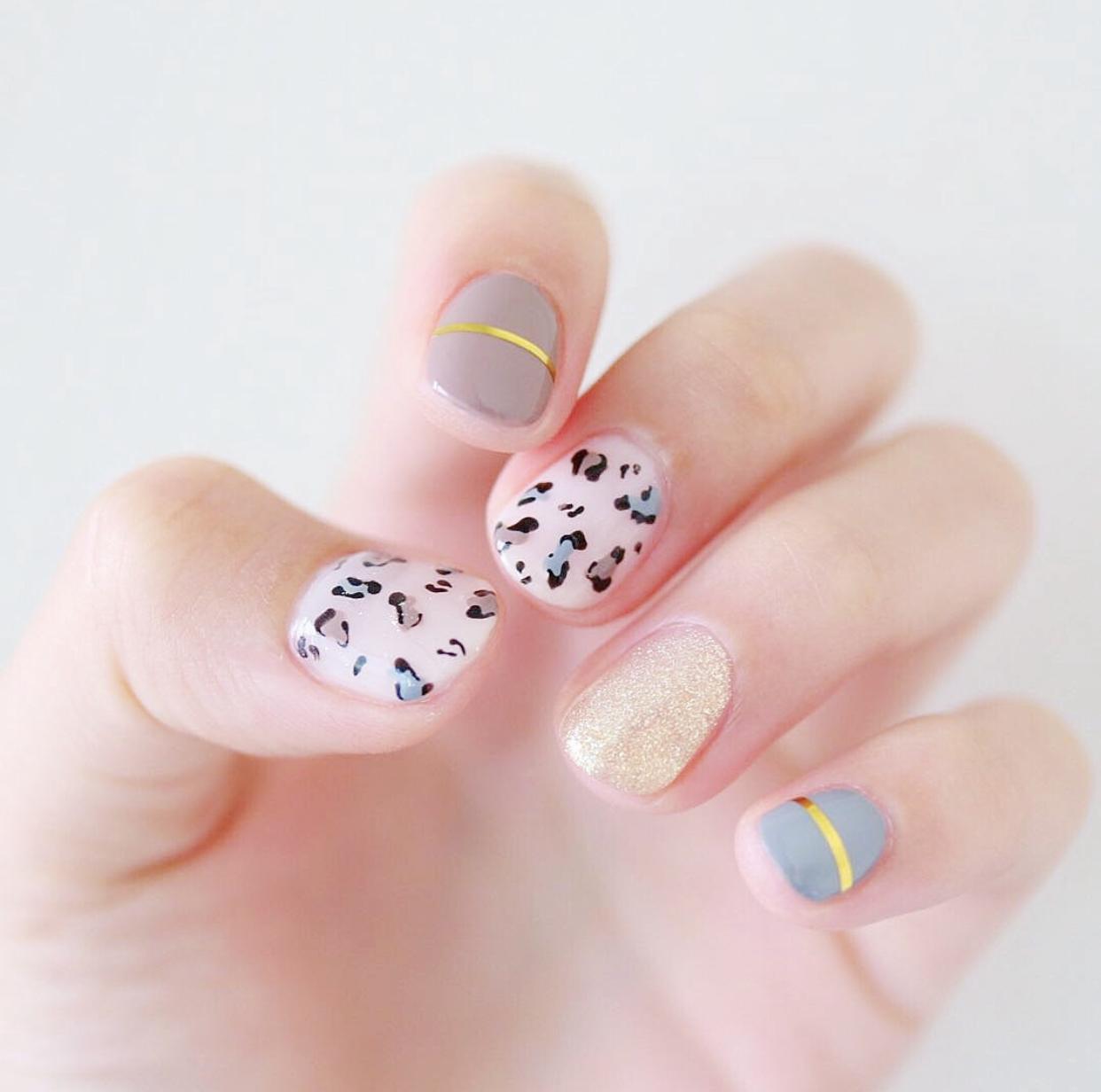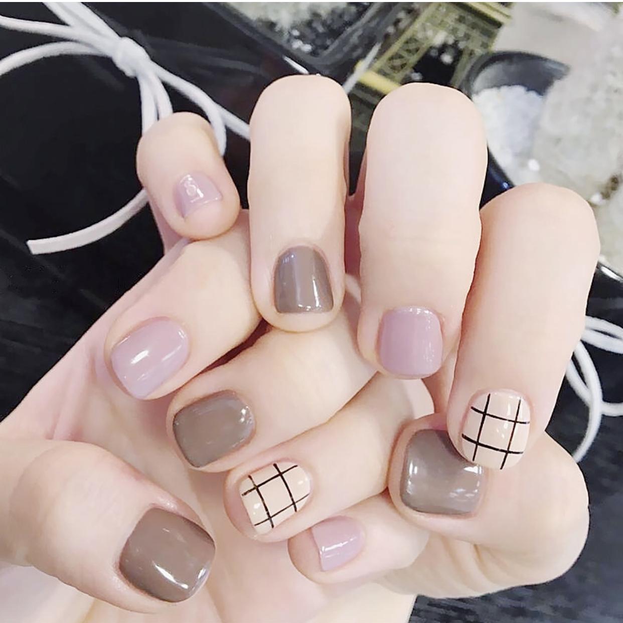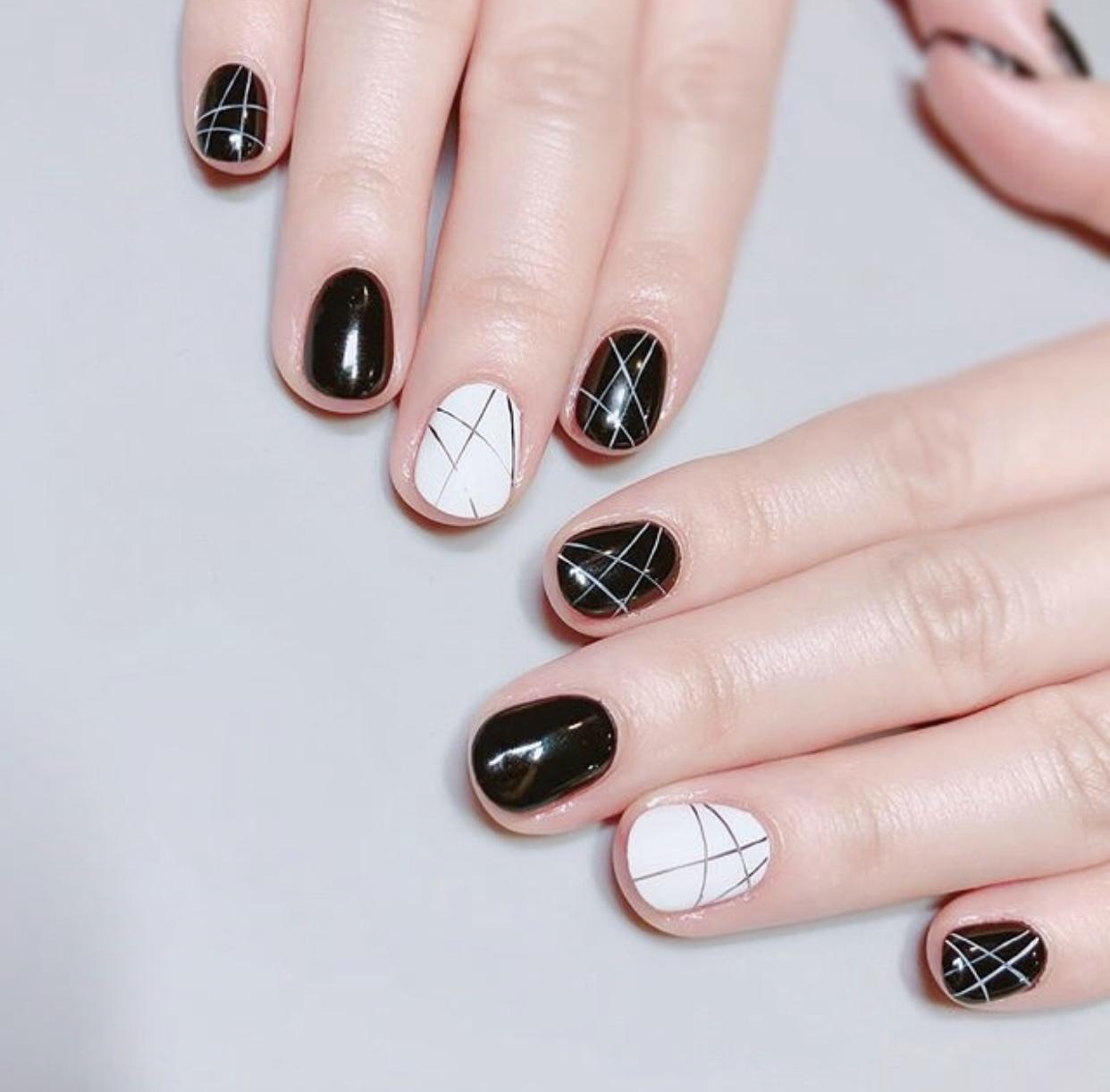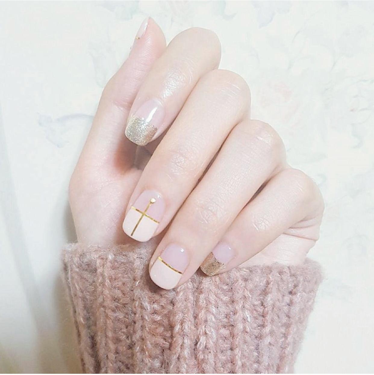 还有一些纵向的线条,也可以很好的达到修饰甲型的作用,像是简约的格纹美甲,清新的文艺风也是非常受欢迎的,还有纵向的金线,会拉长指甲的视觉比例,让短圆甲看起来更加修长,同时又让甲面更有精致感了。