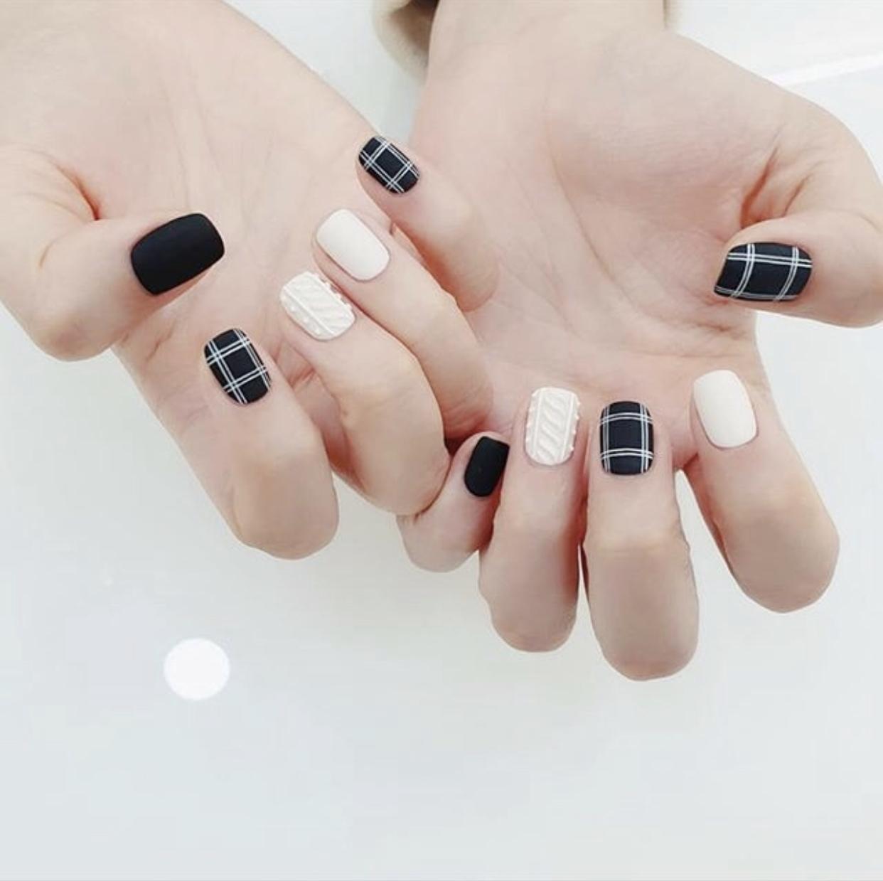 用白色的毛衣纹美甲搭配黑色的格纹美甲,这黑白的对比,立体和平面的对比,让整款美甲看起来格外抢眼,虽然是用到了两种反差极大的颜色和质感,却显得非常和谐,有着高级时髦感。