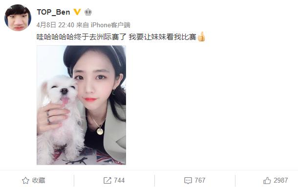 4月8日晚,TOP辅助Ben在微博晒出自己妹妹的照片,并附文:“哇哈哈哈哈终于去洲际赛了,我要让妹妹看我比赛。”