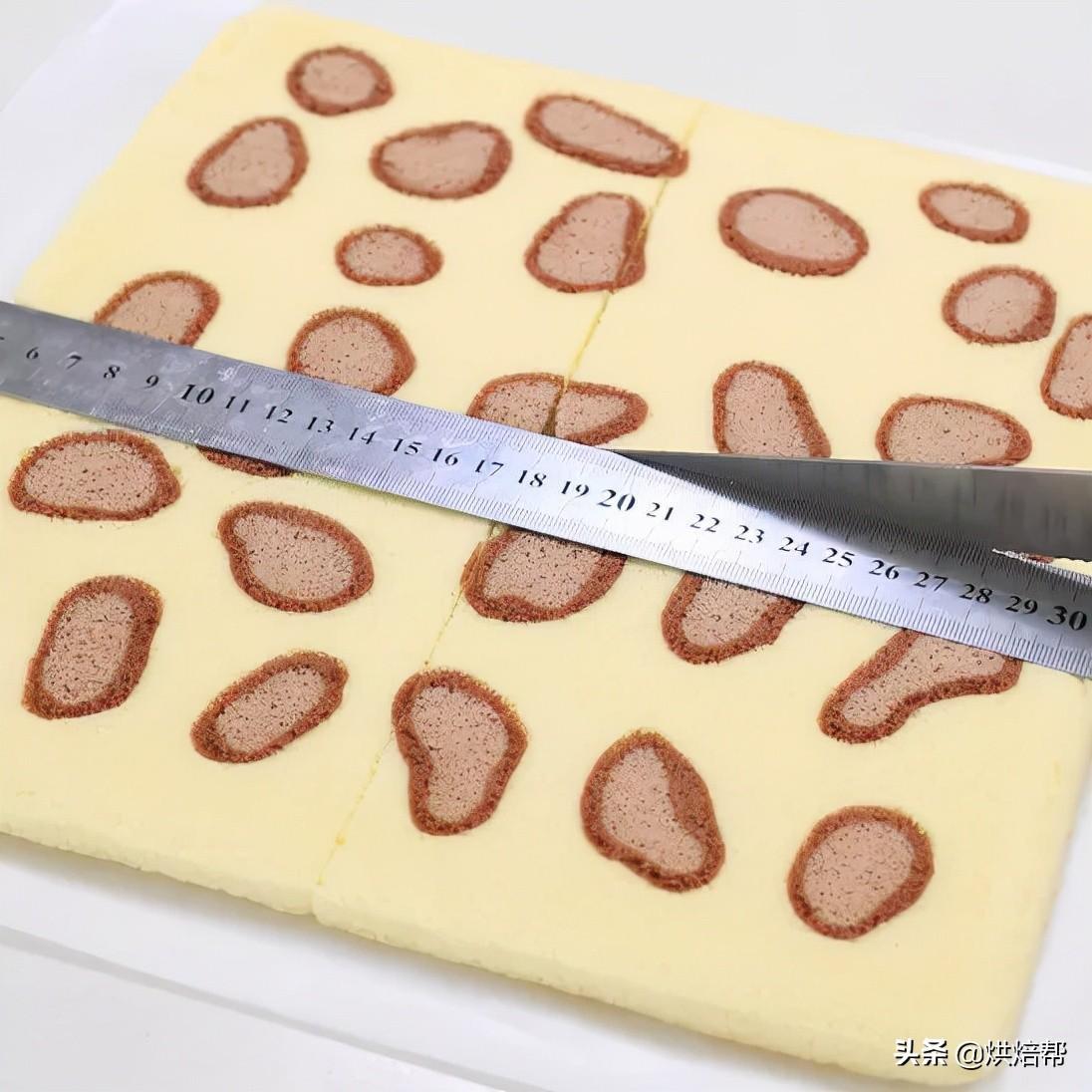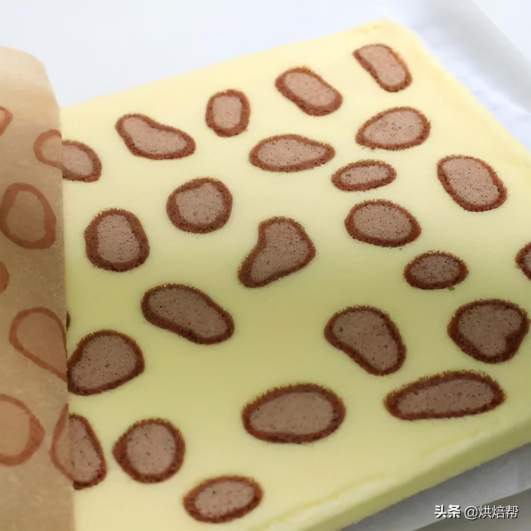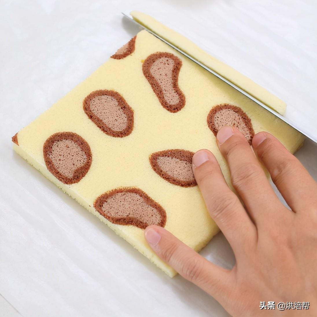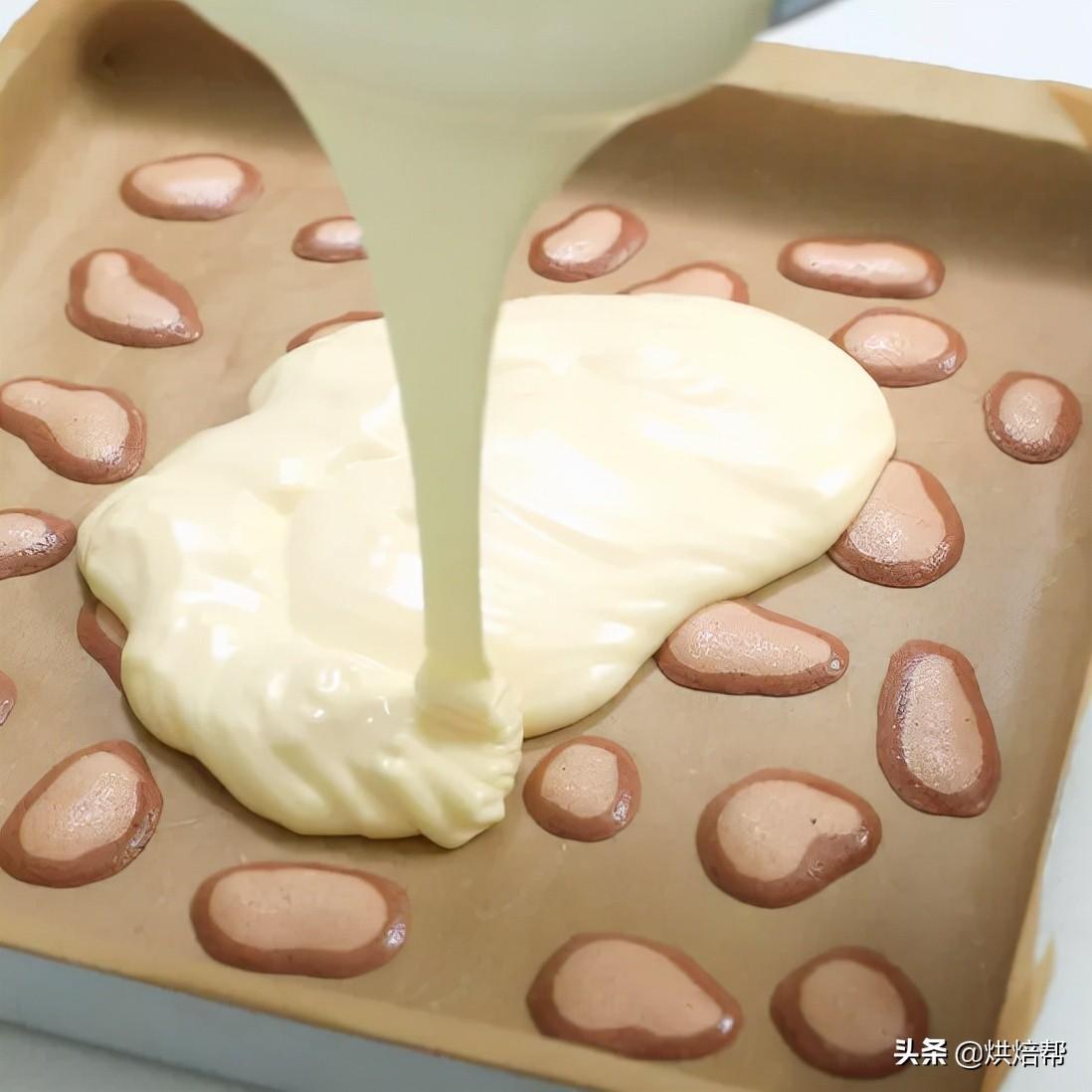 给裱花袋剪一个很小的口子,先挤浅色可可蛋糕糊,画出不规则的斑点形状。