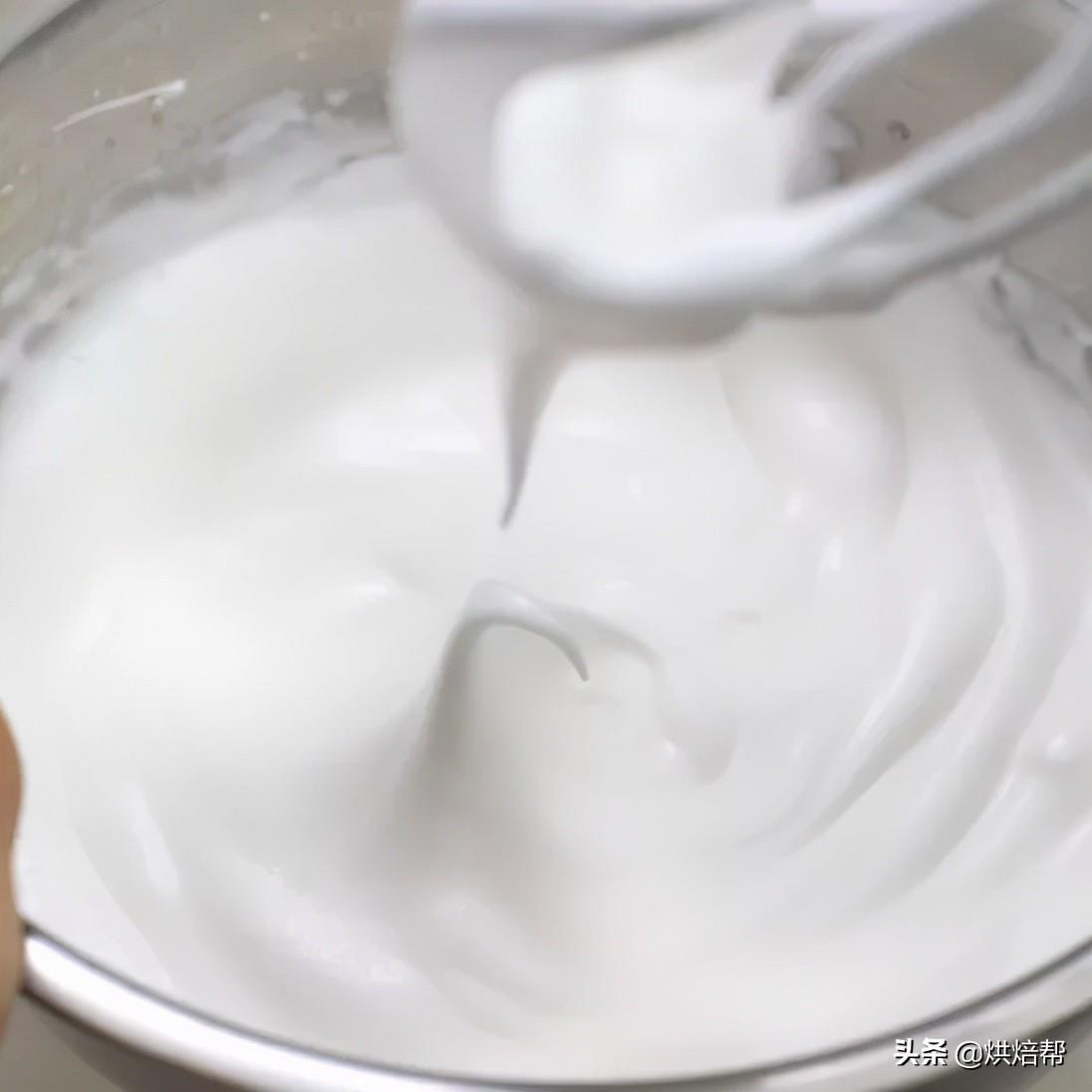打蛋器先高速打发,然后转为中低速,这样既兼顾了打发速度,又不容易打发过度。直到蛋白霜可以提出一个柔软的弯钩,就是中性发泡了。