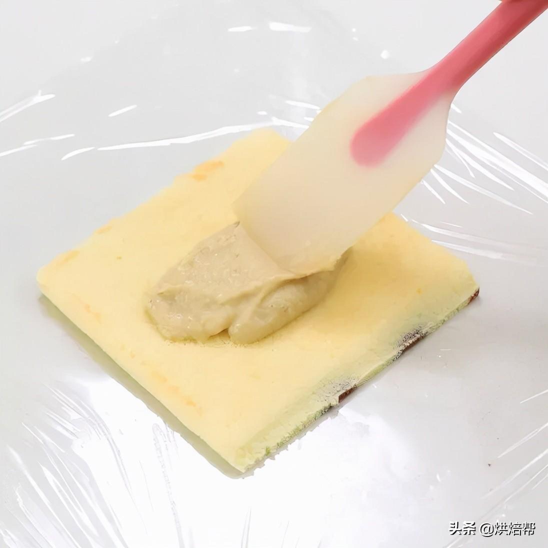 底部垫保鲜膜,蛋糕彩绘面朝下,表面挤适量香蕉卡仕达酱。