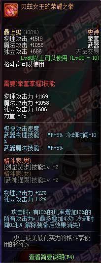 90ss拳套,且听我细说:首先,两级觉醒,男格斗的觉醒就像全程buff,真是满身是活干烧安图恩的龟毛就能杀它,女武神的大脚,在韩服配合万世荣光套打卢克15E,逆天!无条件加所有攻击力12,还能叠加4次12%,总共是多少:60所有攻击力,我去啊!卢克你赶紧死吧,换二姐赫尔德