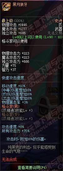 黑月狼牙:90史诗爪子,三级爪精通增加6%面板,所有攻击力35%,和荒古不开魔能一样,再加上附加18白字,完爆荒古,我希望看到更多的卧槽出现在卢克以及安图恩