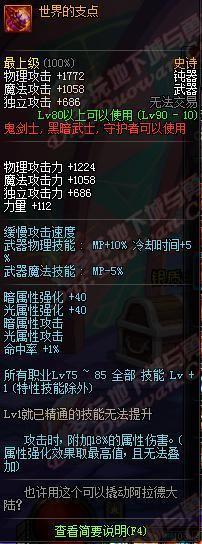 世界的支点,神tm武器介绍给你一个支点,你能翘起来阿拉德大陆,阿基米德的棺材我也快压不住了,你笑死我了!光暗双休,18的属性附加,90级版本人均200以上的属强,直接附加30以上!加了75~85技能一级,大概能提升5吧。