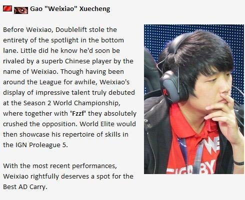 此次捧杯,WE迅速占据世界排名的第一位。而微笑也成为了公认的世界最强ADC!在一份2012年底国外电竞媒体的各位置排名里,微笑光荣入榜,国外的描述如下:在以前,doublelift抢走了下路所有人的眼球,但是他不知道很快的就会有一位与他可以与他媲美的中国玩家,他就是微笑。虽然在之前的联赛中他并没有那样的令人印象深刻。微笑第一次让人记住他就是在本赛季的世界锦标赛上,他与Fzzf完全的打崩了对面的下路。在IPL5的比赛中, WE将微笑的全部实力展现给力所有人。就最近的表现,微笑理所应当的站在这份最出色的ADC名单中