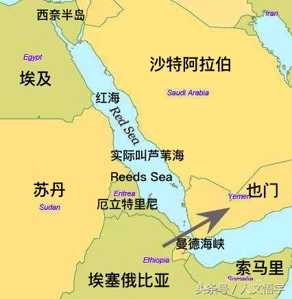 你看,它通过曼德海峡可以直抵阿拉伯半岛西南今也门,往南沿着红海,可以抵达西奈半岛,然后可以进入今以色列及巴勒斯坦,通过叙利亚可以拐入小亚细亚即今土耳其。