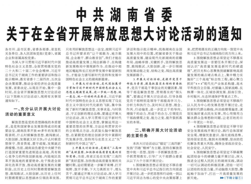 2024 年 2 月 18 日对外公布的《中共湖南省委关于在全省开展解放思想大讨论活动的通知》提到: