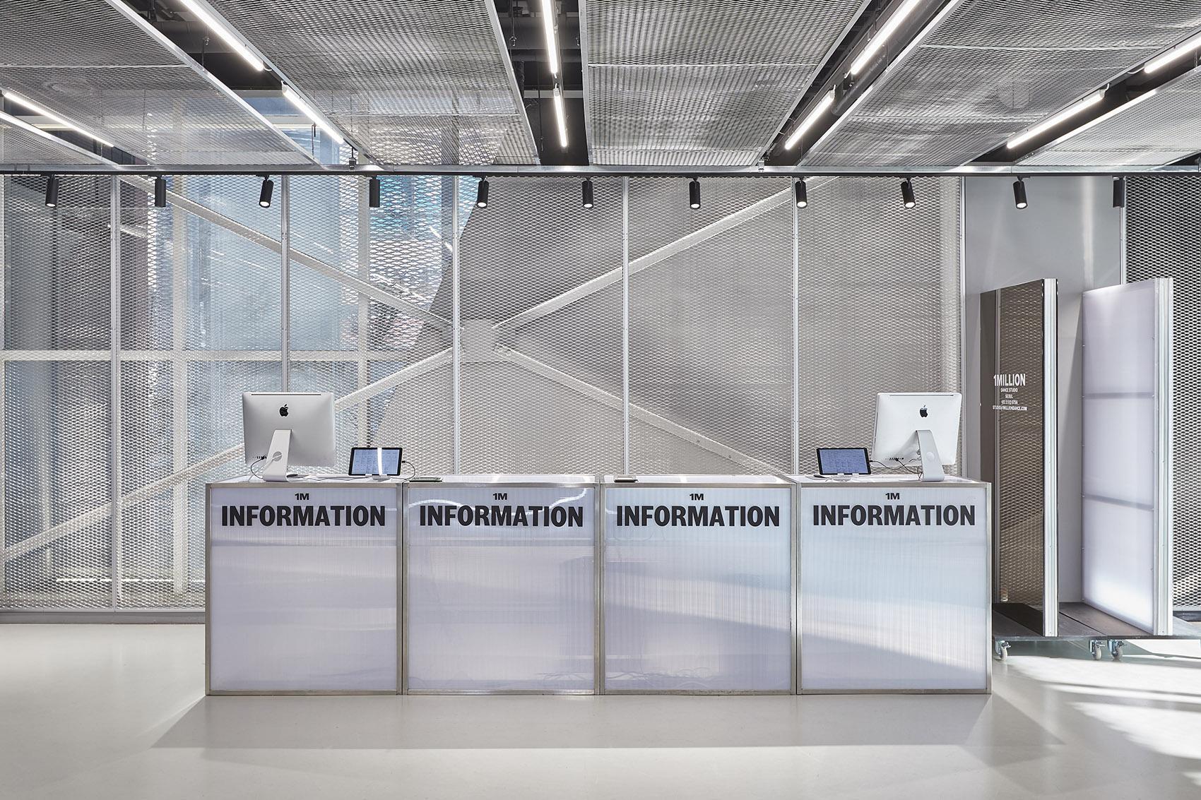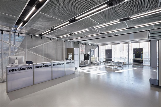 穿孔板是这个项目设计运用到的主要材料,不管是接待处还是空间里的通道,都有大面积地运用到。
