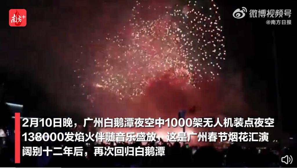 正月初一,广州的烟花秀吸引了 54 万名市民游客 ( 其中外地游客 14 万人 ) 观赏。 ( 图 / 微博 @南方周末 )