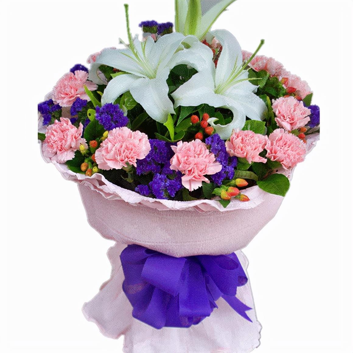 材料:13朵粉色康乃馨,3朵白百合,搭配勿忘我、绿叶点缀。