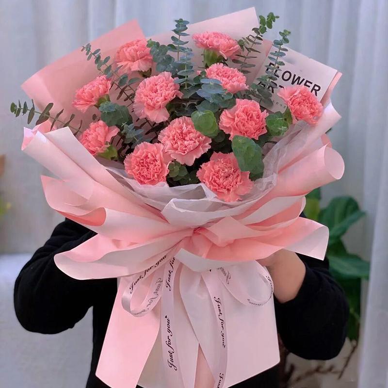 材料:11枝精品粉色康乃馨,搭配尤加利叶装饰。