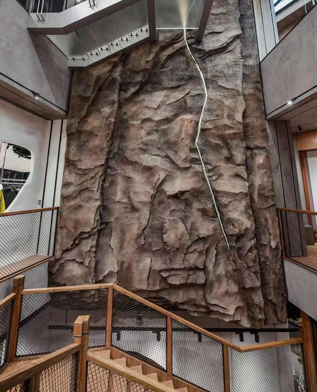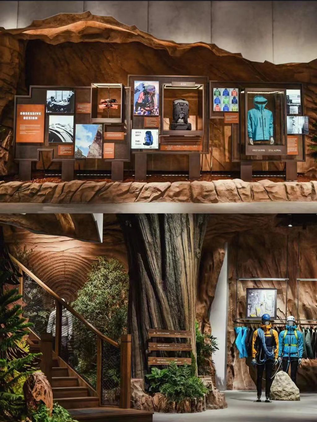 店面设计以加拿大温哥华海岸山脉为灵感,在不同的主题的四层空间里,通过对户外元素、感官体验以及空间构造的重新定义,将空间场景进行在地化延展——攀登石墙、洞穴、印刻着大树年轮脉络的木墙,以及滑雪视频和图片等场景的辅助,迅速将消费者带入品牌场景中,将视觉效果转化为 " 突破极限、向上生长 " 的品牌精神。