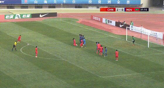 第 32 分钟,中国队前场禁区线边缘定位球,杨黔东主罚稍稍偏出。