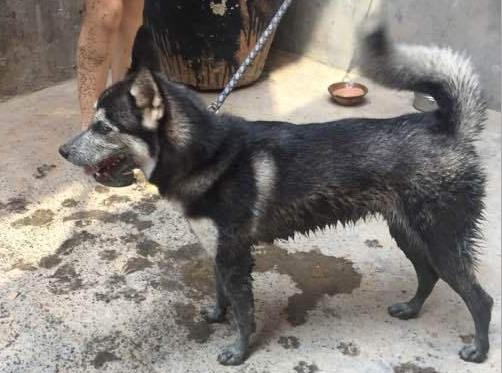 为了防止二哈到屋子里乱转(说不定还会逮着谁抱谁呢~),主人先把二哈栓了掐来,然后先用水冲了一遍,这当然肯定是洗不干净的……