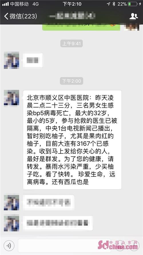 “北京市顺义区中医医院:昨天凌晨二点二十三分,三名男女生感染bp5病毒死亡,最大的32岁,最小的5岁,中央1台电视新闻已播岀,暂时别吃柚子,尤其是果肉红的柚子,目前大连已有3167个已感染,收到马上发给你关心的人,最好是群发……暴雨水污染严重,少买柚子吃……还有西瓜也是。”近日,一则这样的消息频频出现在微信群和朋友圈中,不少市民致电中国山东网青岛频道热线(0532—85712988)询问,这健康美味的柚子还敢不敢吃了?而记者调查发现,这则消息早在1月6日就在网上出现,而北京市顺义区卫生计生委官方微博也发布辟谣称“近日,自媒体上再次流传‘顺义区中医医院有3人因感染SK5病毒死亡,参与抢救医生已被隔离”消息,经顺义区中医医院核实,该信息纯属谣言。’”辽宁省大连市公安局网络安全保卫支队的官方微博也在3月8日辟谣称“此信息为谣言”。