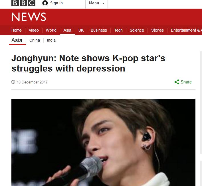 韩国艺人SHINee成员金钟铉于12月18日晚不幸离世,其葬礼将于21日举行。据悉,金钟铉的死亡不仅在韩国的娱乐圈引起轩然大波,在亚洲各国甚至一些世界主流媒体如Billboard、Variety都有报道他的死讯,英国的BBC更是长文报道。