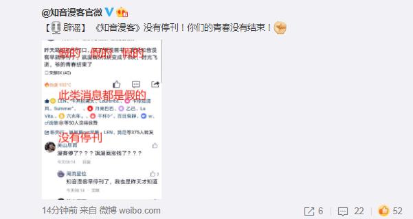 8月5日,知音漫客官微对网传消息进行回应: 《知音漫客》没有停刊!你们的青春没有结束!