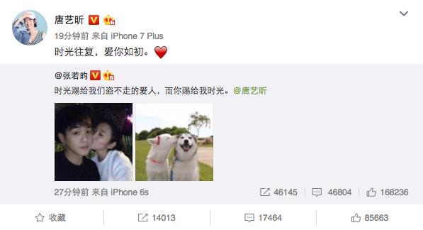 这一口狗粮真是喂得猝不及防,粉丝和网友都祝福满满。唐艺昕还微博评论:好害羞。真是甜到不行。