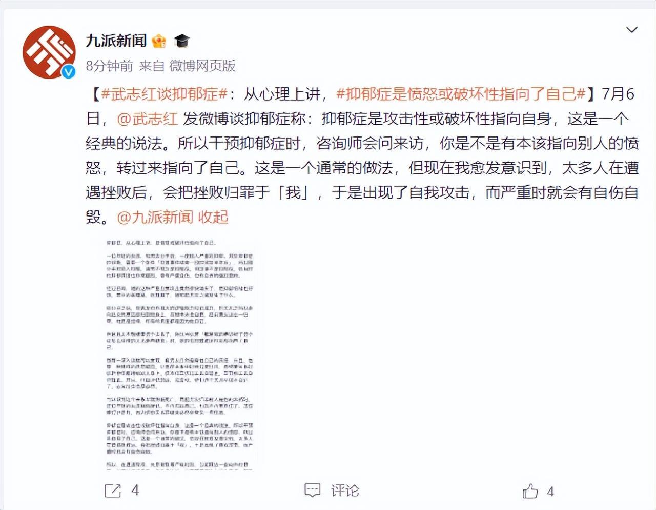 7月6日,@武志红 发微博谈抑郁症称:抑郁症是攻击性或破坏性指向自身,这是一个经典的说法。