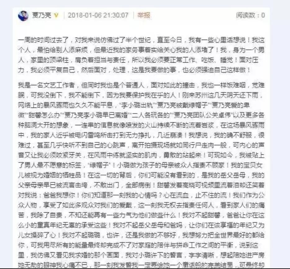 贾乃亮原文:我对不起璐璐,也许,还是我做的不够好,我想努利巴全天下最好的都给你,可我用尽全部的能量终极却完成不了对家庭的伴随与冒死工作之间的平衡,说到这里,我似乎又瞥见我求婚的谁人画面,我对小璐许下的誓言,字字明晰,想起陪她进产房她无助的眼神我心痛不已,那一刻我赌咒我肯定要给她一个童话般的完满结局,可终极却变成了最大的遗憾……