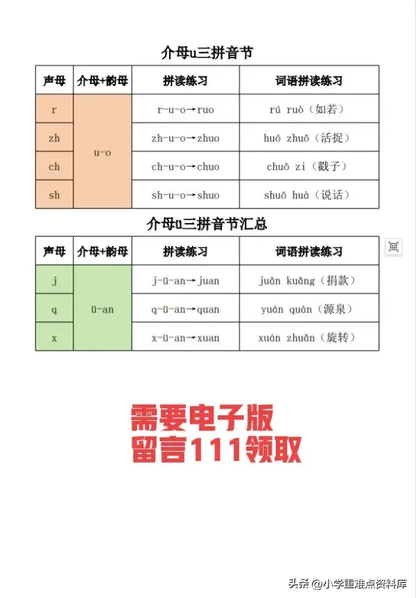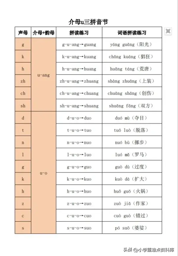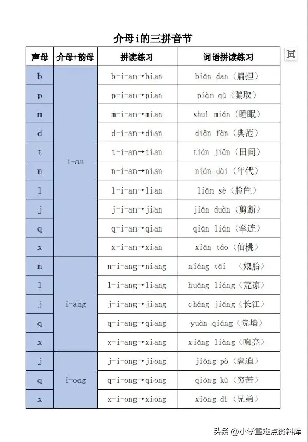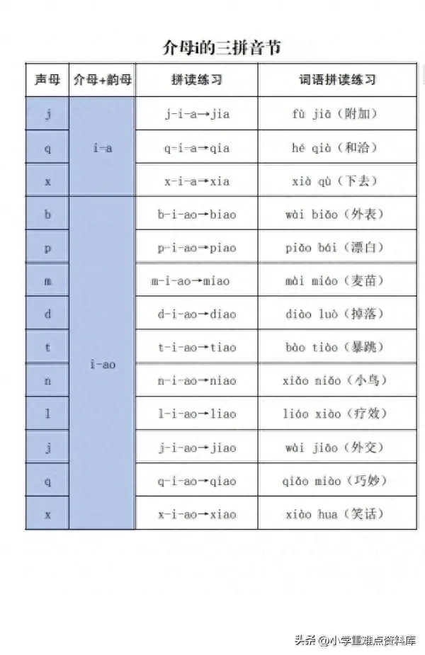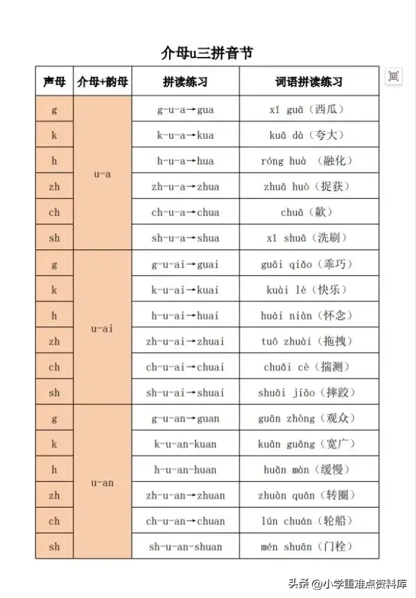 小学拼音,三拼音节介母汇总表