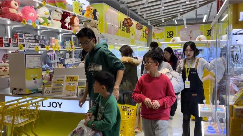 今年春节,在热闹非凡的商场和庙会中,除了琳琅满目的年货和五彩斑斓的灯光,还有一样特别吸引人的东西——抓娃娃机。这些机器里装满了价值从几十元的毛绒玩具到更为便宜的如旺仔牛奶、糖果、辣条等各式各样的零食,吸引了各个年龄层的消费者将抓娃娃机围了一圈又一圈。