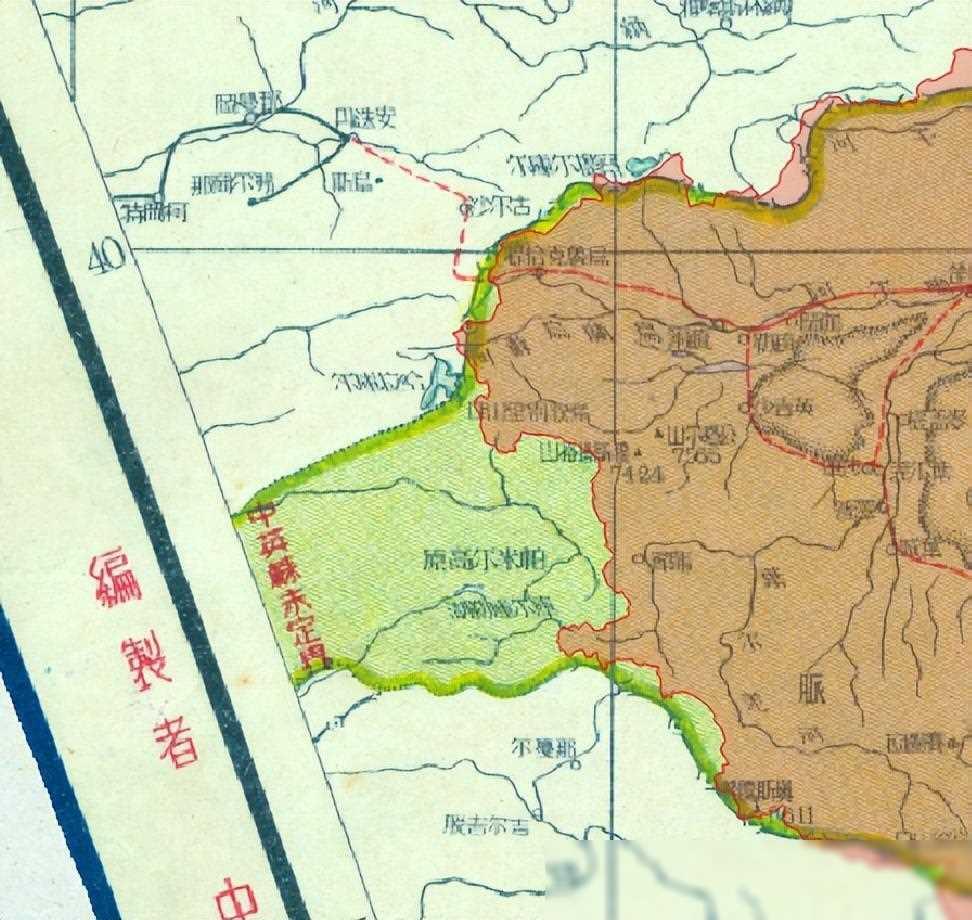 到了1945年,随着抗日战争的胜利,这份地图的边界有了新的变动。蒙古地区虽仍标为中国领土,但其边界已略有调整,特别是在其西部区域。而对于帕米尔高原,这一次地图上已不再将其标注在内,只留下了“未定界”的字样,仿佛是对那块土地的一种无奈放手。江心坡的标注则展现了更大的领土范围,这背后或许是为了未来领土谈判的需要,留下更多的谈判空间。