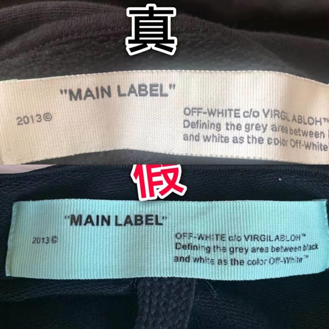 正品Off-White领标上“OFF-WHITE”字母为居中刺绣,字体清晰工整,而假的标容易出现字母不居中,两端固定缝线颜色不对等问题。