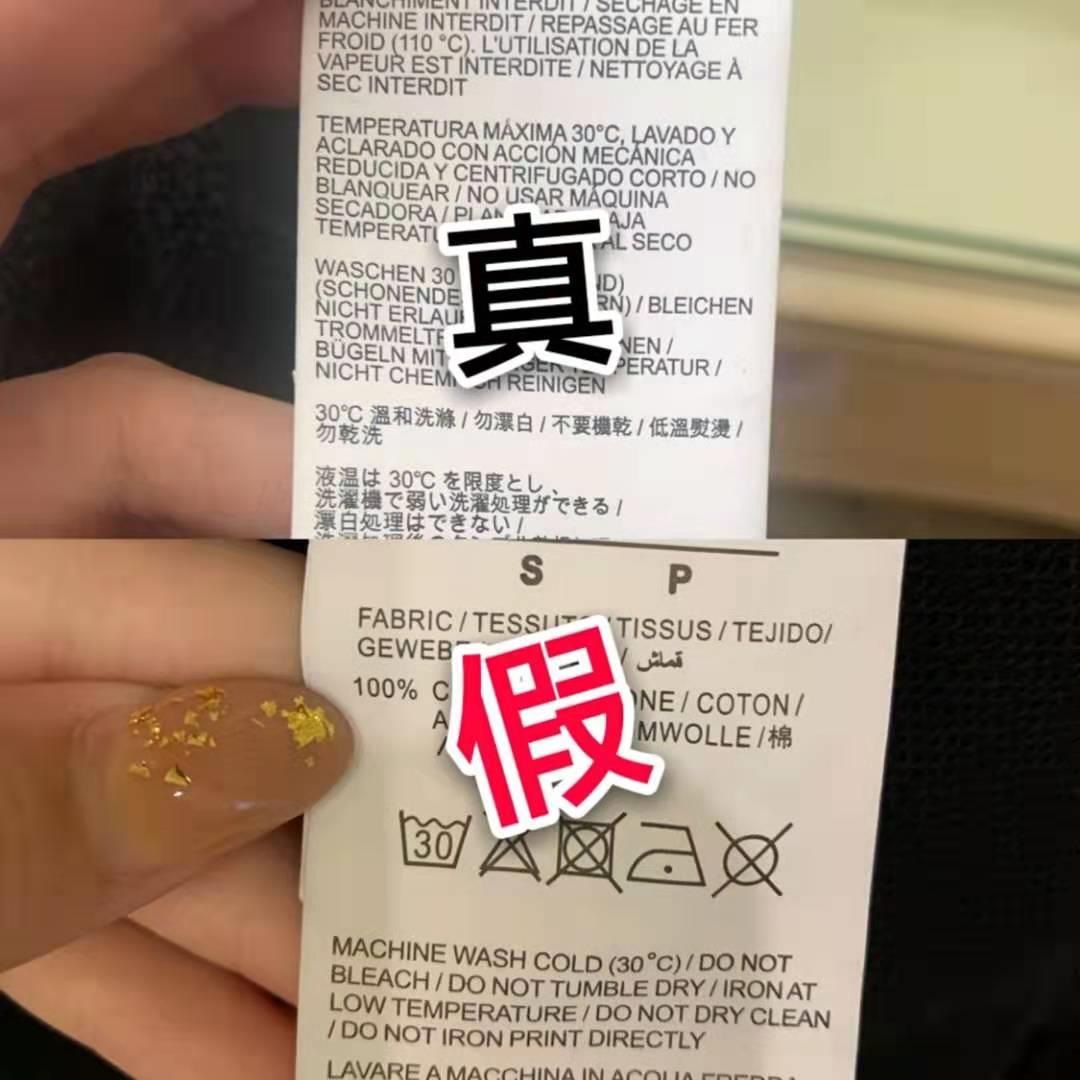 正品第二联的洗涤标志除第二行首个弱速30度下洗标志外,其他都是加粗印刷。多国语言材质描述下面的尺码及品牌标志也是粗体印刷,且洗标所有印刷都是非常清晰的黑体。