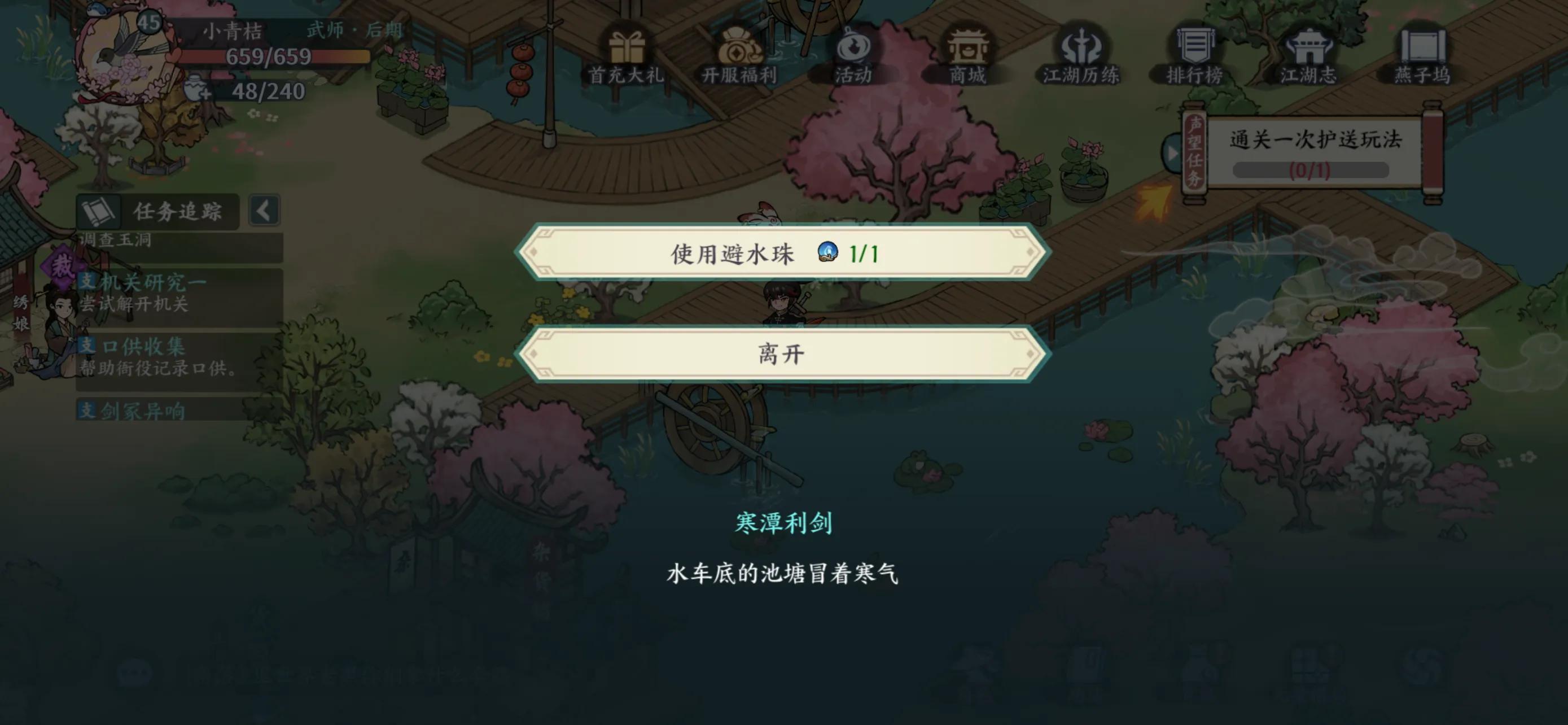 避水珠是重要的道具,很多玩家不知道避水珠在哪,其实需要通关蛇窟副本进行战斗,等我们把所有的怪物全部打完之后就可以获得避水珠,避水珠放在水车哪里可以触发江湖事件。