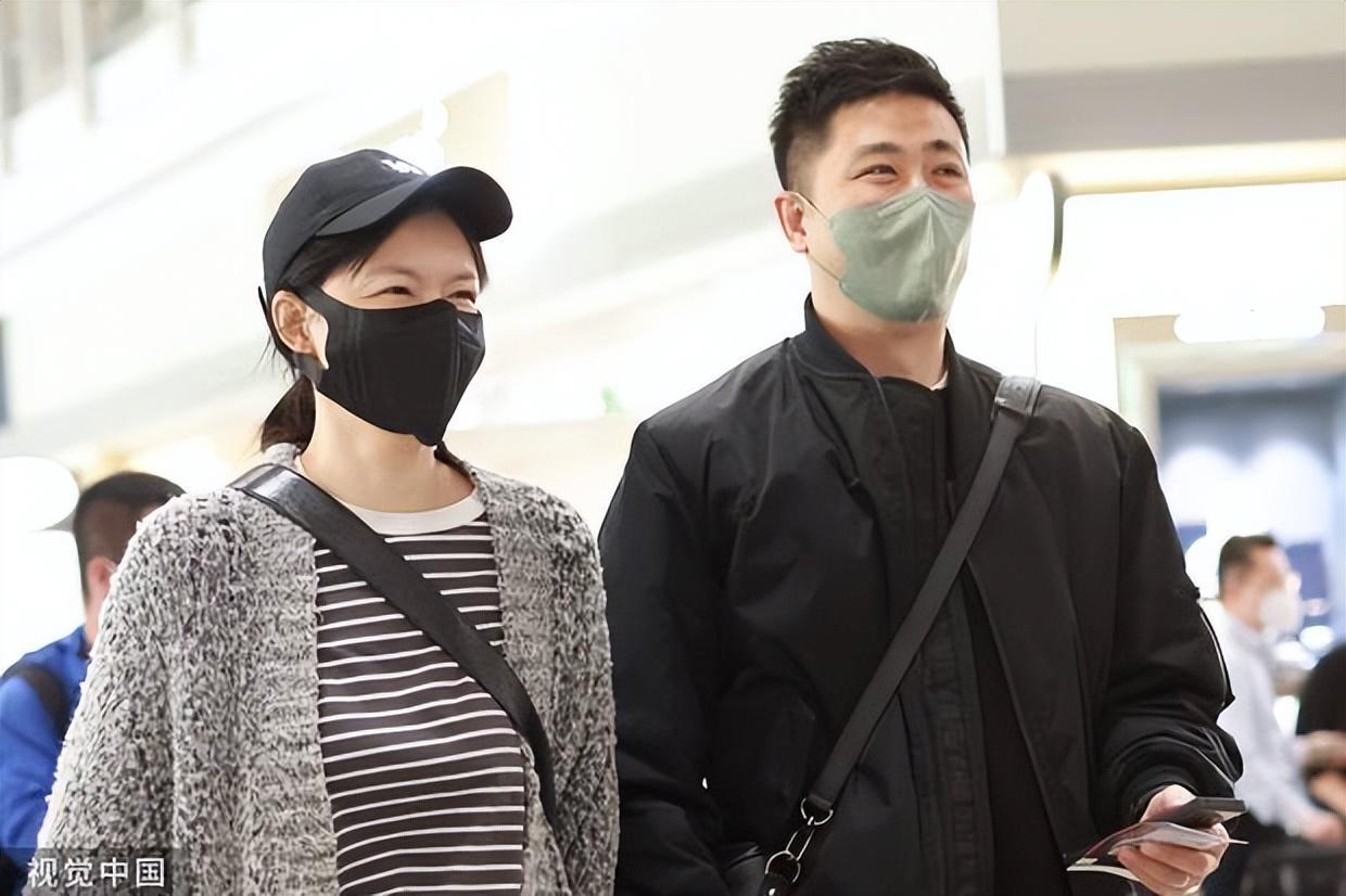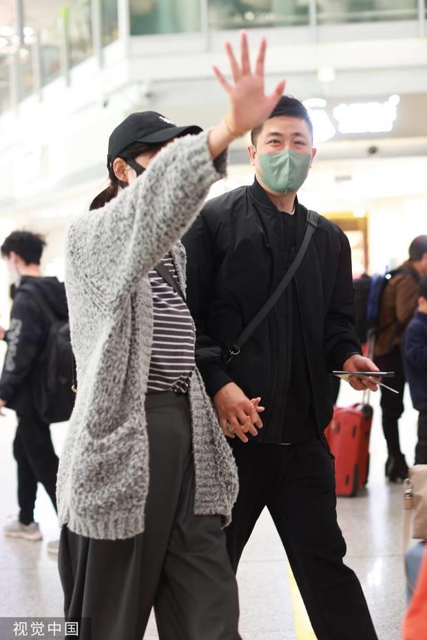 李艾与老公张徐宁牵手现身机场 穿着休闲互动甜蜜