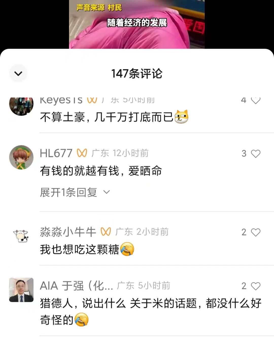 也有网友似乎看透了一切,评论道:不算土豪,几千万打底而已;有钱的就越有钱,爱晒命;猎德人,说出什么关于米的话题,都没什么好奇怪的。