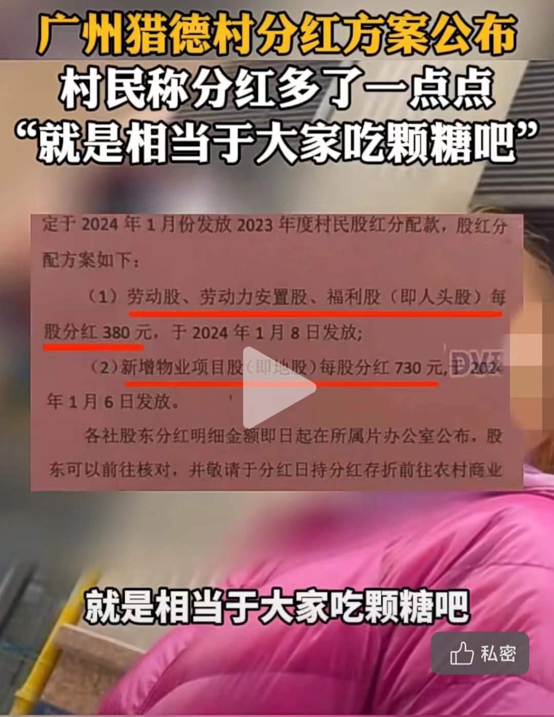 从网传的猎德村分红方案可以看出,劳动股、劳动力安置股、福利股(即人头股)每股分红380元,新增物业项目股(即地股),每股分红730元。