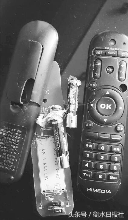 事发当天下午,马先生的妻子突然听到“砰”的一声,但又不知响声从何而来。马先生回家后,开始寻找声响来源,根据妻子的描述,在一个抽屉中发现了已被炸成三片的遥控器。所装的两节南孚电池中,有一节的负极已经爆裂,内部填充的纸屑也炸了出来,“一点外力也没受,就这么突然炸了。炸成这样,当时的威力肯定不小。”