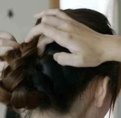 6:然后将发辫折起,将发尾插入这个洞中,并用手按住,最后用适当的发卡将它固定,一款完美的五股麻花辫就完成了。