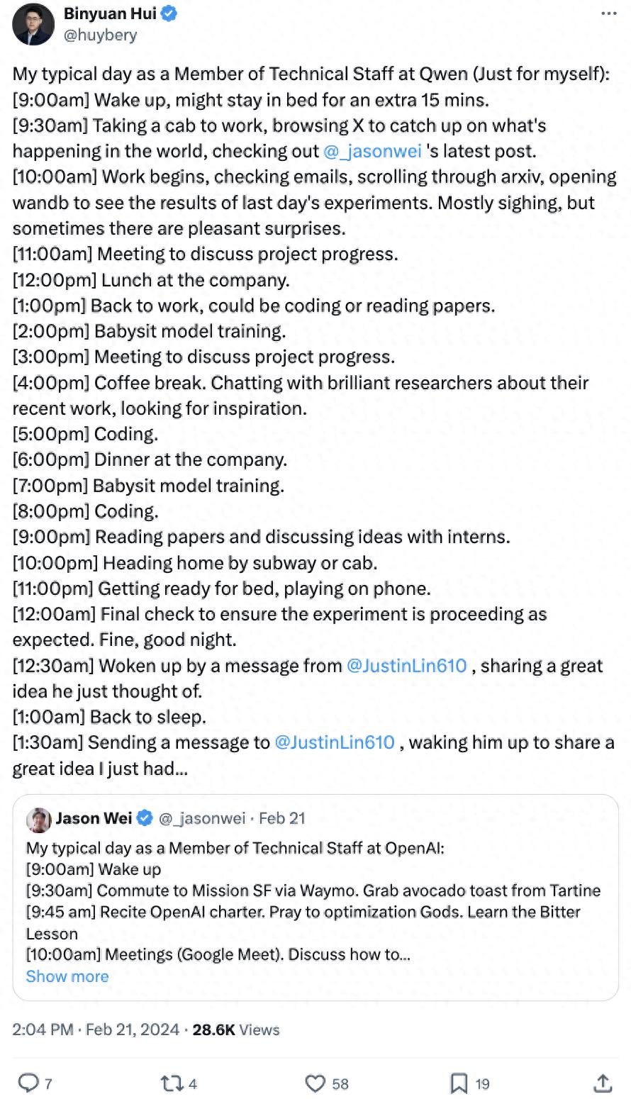阿里通义千问团队 NLP 研究员 Binyuan Hui 晒出了自己的一天: