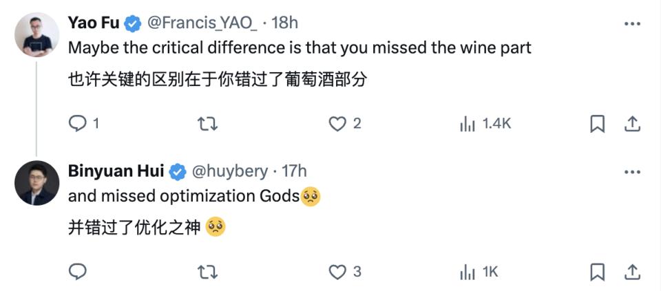 也有眼尖网友当即指出 Binyuan Hui 相比之下 " 关键区别就是没喝点小酒 ",Binyuan Hui 本人又补充了一点 " 没有向优化之神致敬 ":