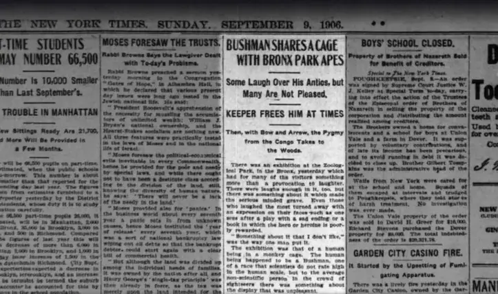 纽约时报 1906 年 9 月 9 日的第一版展示了 Ota benga 被囚禁的起义丑闻。