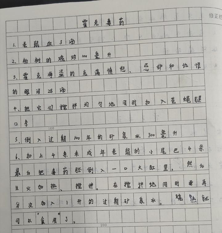 第三位小学生作文中的毒药配方是“霍克毒素”。其中用到的材料有,老鼠血、柏树的琥珀、霍克海盗的充满愤怒、嫉妒和仇恨的眼泪、苍蝇腿、过期100年的矿泉水、未成年老鼠的小尾巴等等。看这位小学生的描述挺“毒”的,但是不知道“毒药”的效果会怎么样,会不会也是过期毒药呢?