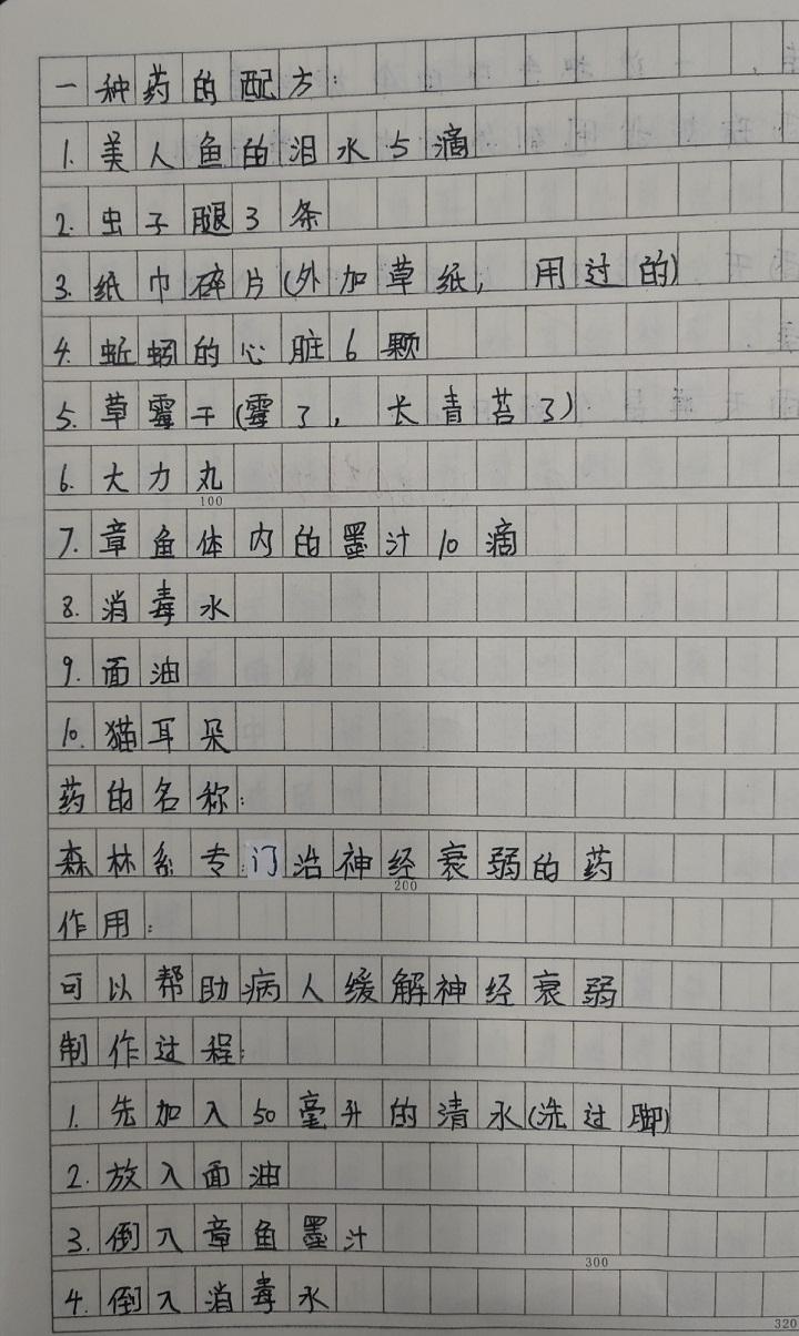 第六位小学生作文中的毒药配方是“森林系专门治神经衰弱的药”。其中用到的材料有,美人鱼的泪水、虫子腿、纸巾碎片、蚯蚓的心脏、草霉干、大力丸、章鱼体内的墨汁、消毒水、面油、猫耳朵等等。药的作用是,可以帮助病人缓解神经衰弱。适用人群是,给孩子辅导作业的家长。