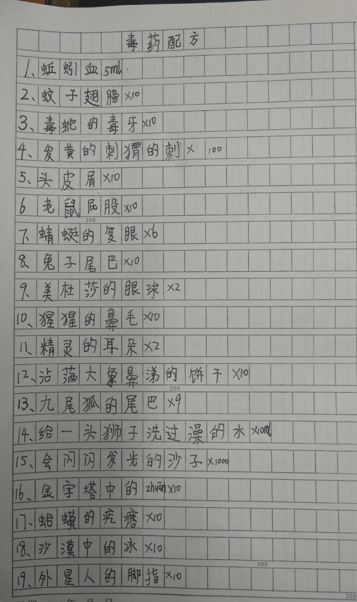 第四位小学生作文中的毒药配方是“毒药配方”,未命名。其中用到的材料有,蚯蚓血、蚊子翅膀、毒蛇的毒牙、发黄的刺猬刺、头皮屑、老鼠屁股、蜻蜓的复眼、兔子尾巴、美杜莎的眼球、猩猩的鼻毛、精灵的耳朵、沾满大象鼻涕的饼干、九尾狐的尾巴、给一头狮子洗过澡的水、会闪闪发光的沙子、金字塔的砖、蛤蟆的疙瘩、沙漠中的冰、外星人的脚指等等。不得不说,这位小学生的毒药配方还真的是挺难得的。