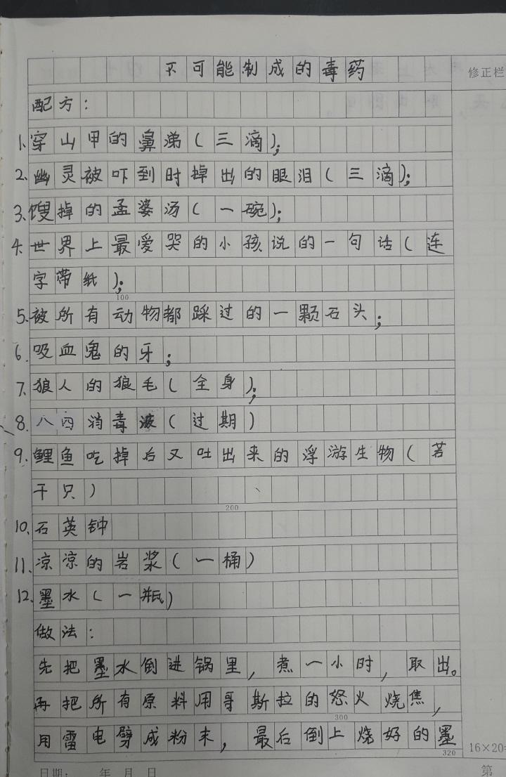 第五位小学生作文中的毒药配方是“不可能制成的毒药”。其中用到的材料有,穿山甲的鼻涕、幽灵被吓到时掉出的眼泪、馊掉的孟婆汤、世界上最爱哭的小孩说的一句话、被所有动物都踩过的一颗石头、吸血鬼的牙、狼人的狼毛、八四消毒液、鲤鱼吃掉又吐出来的浮游生物、石英钟、凉凉的岩浆、墨水等等。不得不说,这位小学生还是挺实在的,因为他这份配方真的是“不可能制成的毒药”。