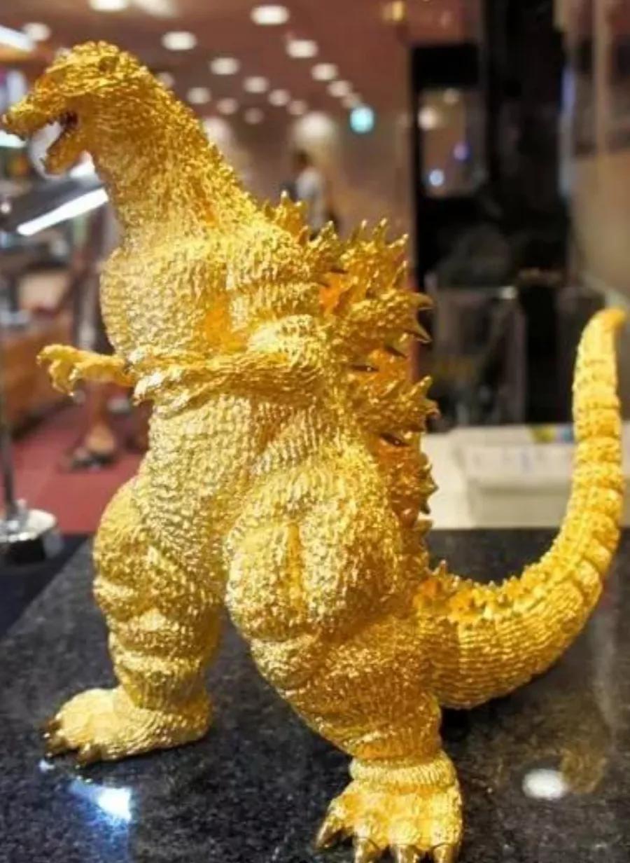 这款黄金哥斯拉由日本珠宝店田中银座高为24厘米,重达15公斤,由24K黄金打造而成,外观设计基于1989年的电影《哥斯拉之真假对决》。最初定价750W人民币,但最后的价格则上升到了916W。